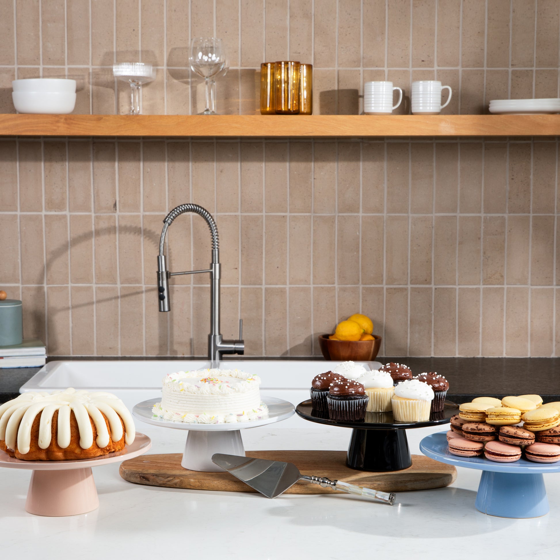 This elegant ceramic cake stand features a classic pedestal design with a stunning gloss finish that adds sophistication to any dessert display. The durable ceramic construction provides a stable, reliable base for showcasing cakes, cupcakes, pastries, and other treats at parties, weddings, or everyday entertaining. Its timeless design effortlessly complements any décor style, from modern to traditional, making it a versatile addition to your kitchen or dining collection.